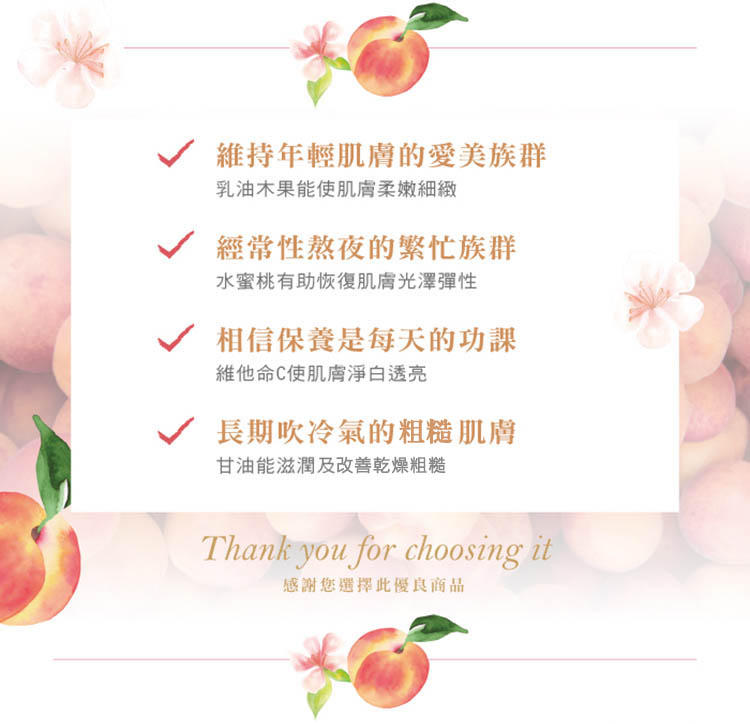 - 嚴選純植物成分,溫和的潔淨因子,讓洗後肌膚清爽柔嫩 - 添加水蜜桃及杏桃萃取精華,維持肌膚嫩白透亮- 綿密泡泡散發蜜桃與杏花的甜美香氛,宛如沐浴在清新的春天裡,為疲憊身心帶來新生的活力感受